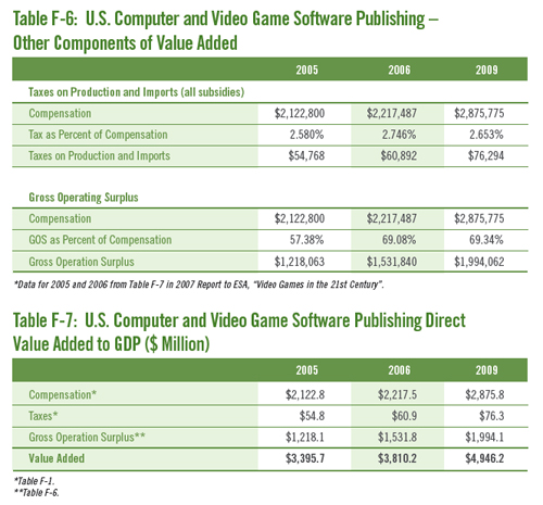 The report used a variety of sources to come up with the $4.9 billion figure in relation to value added to the GDP. These sources included Game Developer Research and Salary Reports in addition to press releases. A pair of tables showing some of their handy work in arriving at the final figure is shown below.