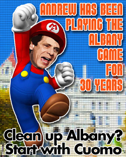 The latest flyer features Cuomo’s face on a caricature of Mario under the headline “Andrew Has Been Playing the Albany Game for 30 Years.”